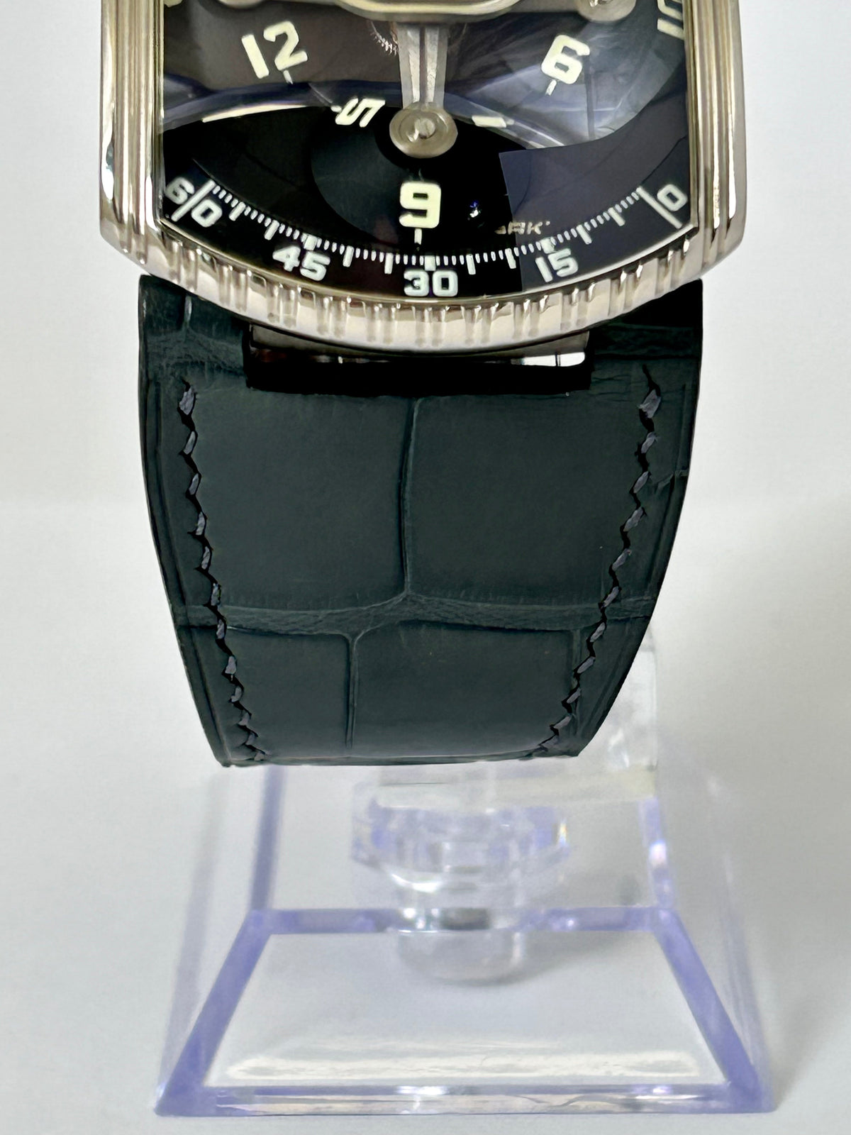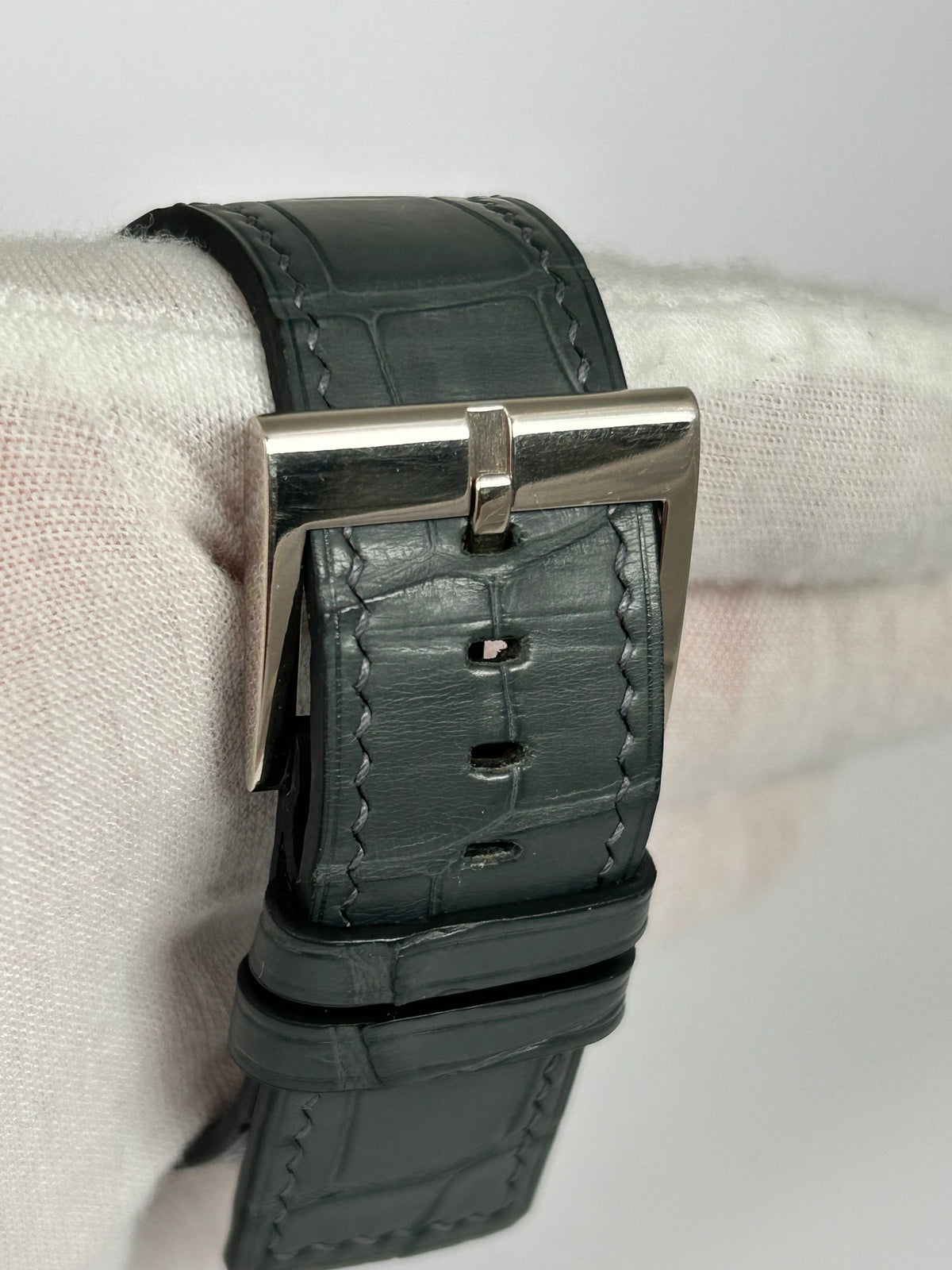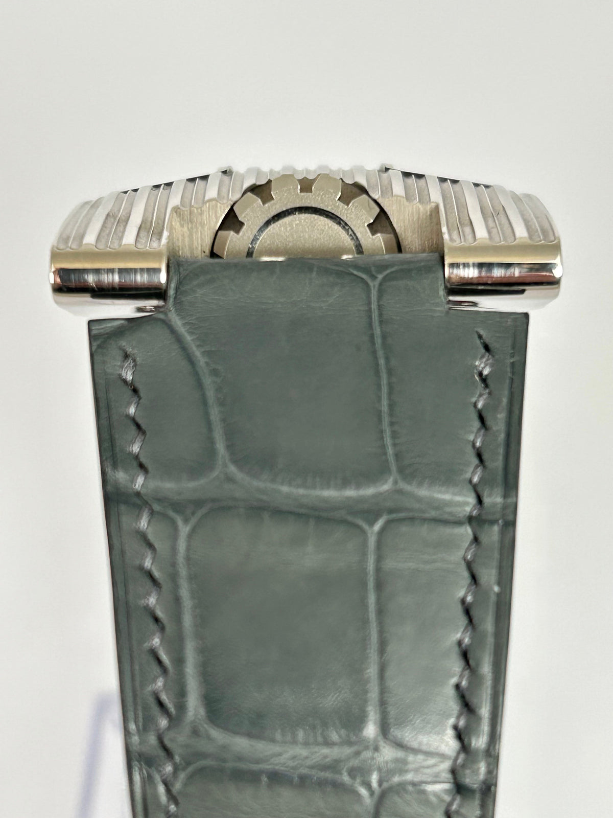 It’s currently mounted on a grey aftermarket strap which pairs perfectly with the watch and includes the original brown croc strap, double boxes, stamped paper and manual.