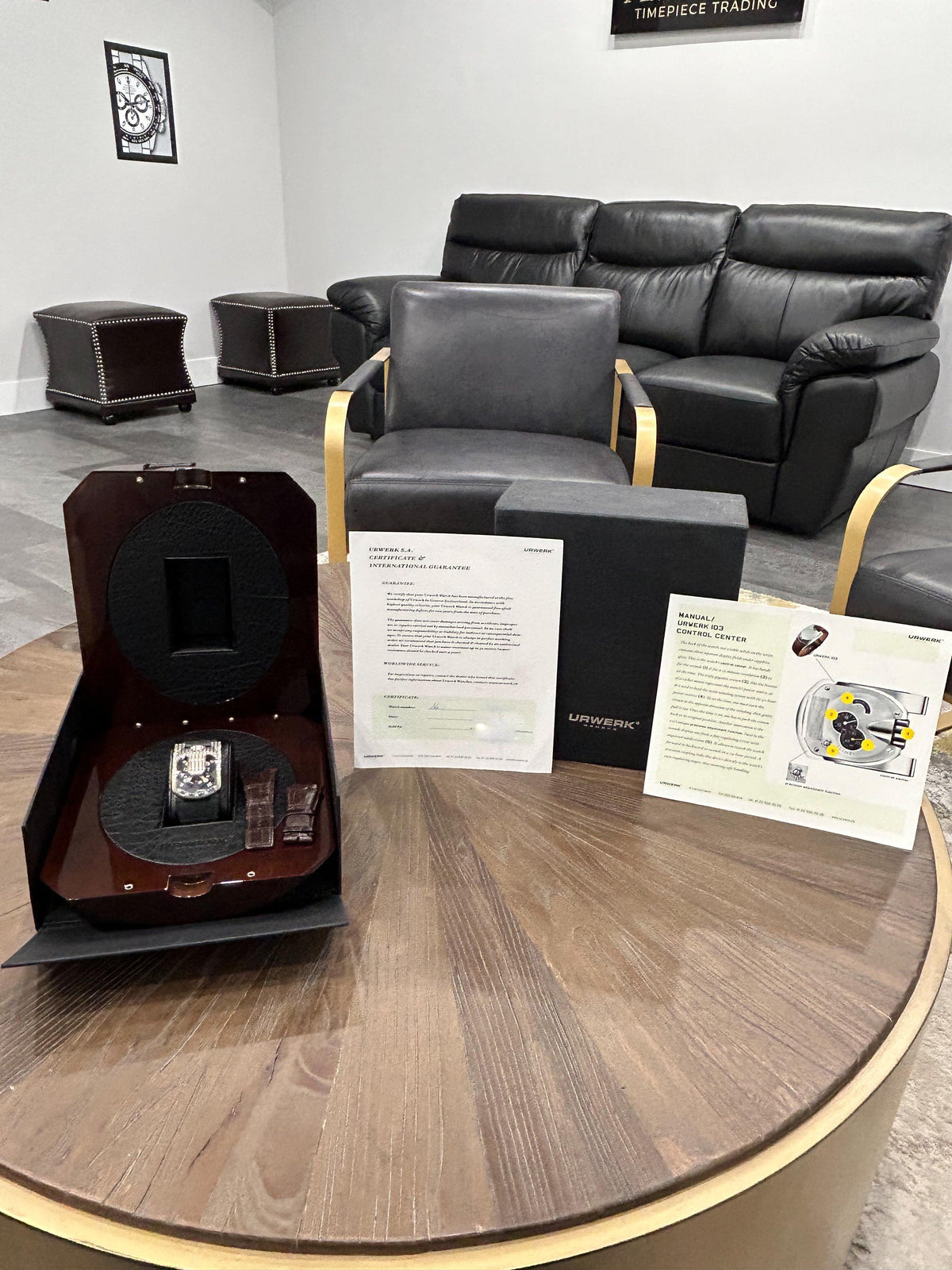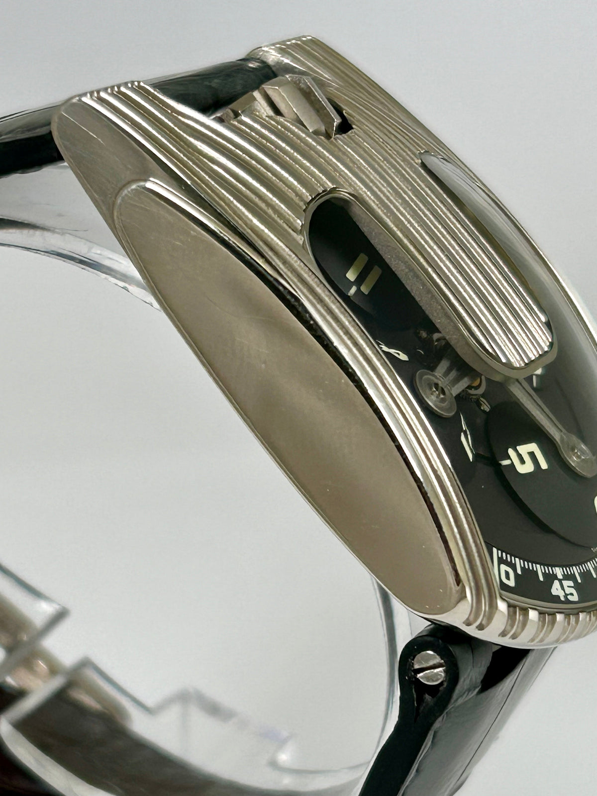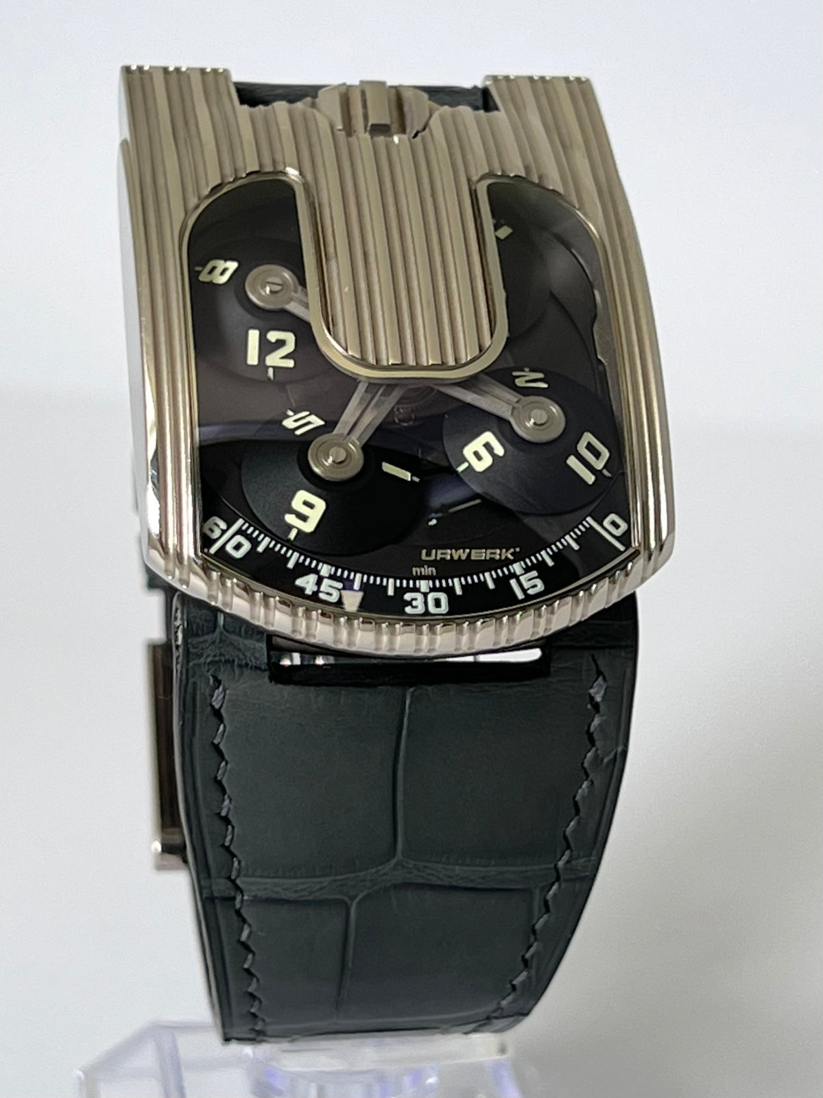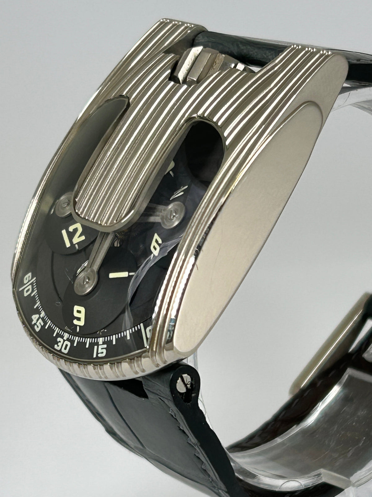 It’s currently mounted on a grey aftermarket strap which pairs perfectly with the watch and includes the original brown croc strap, double boxes, stamped paper and manual.