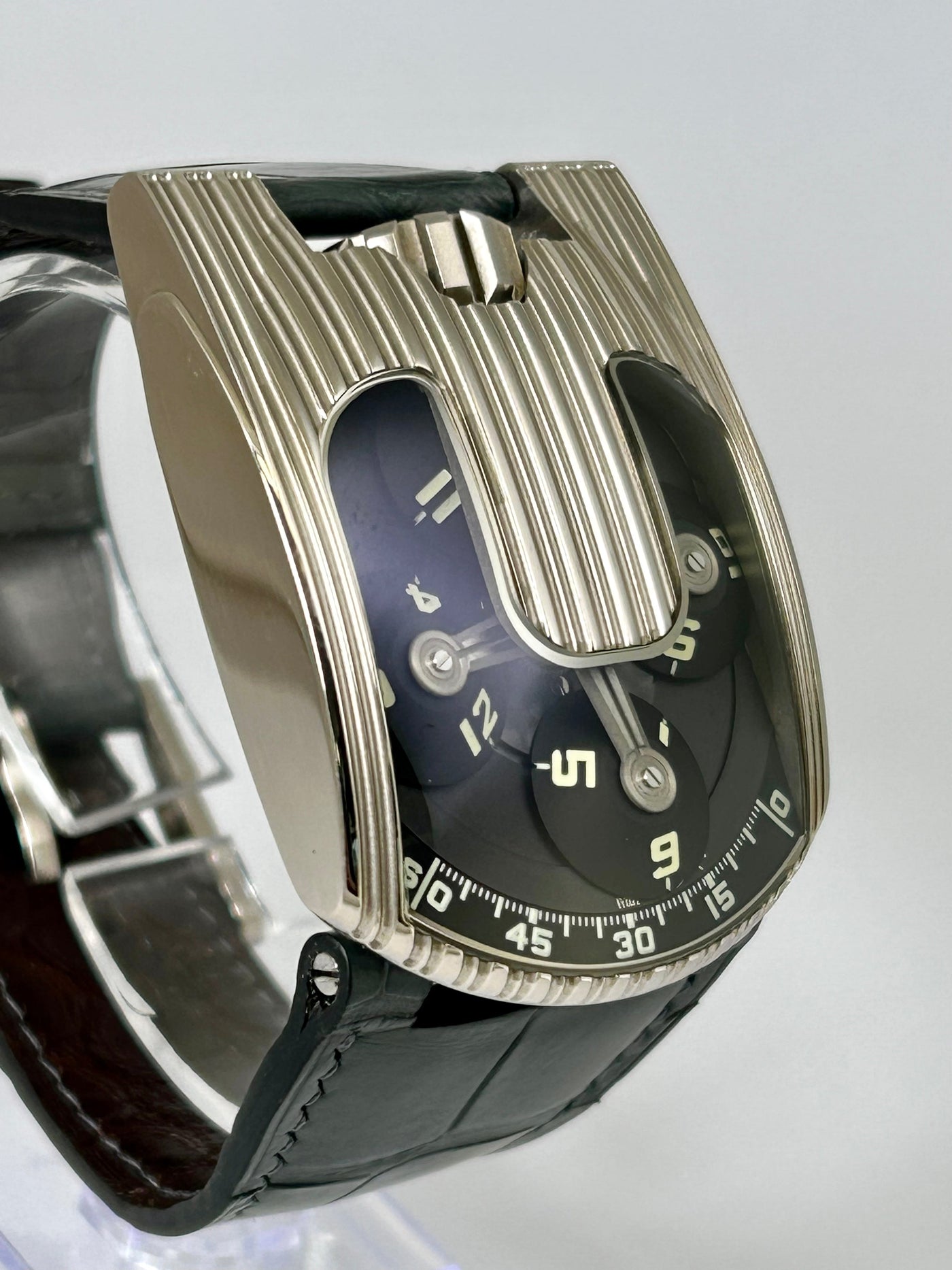 This is a very rare piece that doesn’t come for sale often, especially one with papers. It measures 50mm x 36 mm x 13.5 mm. It features a solid white gold case, satellite shaped rotating dishes with 3 hour markings on each. The caseback features a Power-reserve indicator, 15-minute and 60-second dials, "Chrono Meter", A Fine-Tuning screw which allows the watch accuracy to be corrected to +/- 30 seconds per day. The watch is in excellent, unpolished condition.