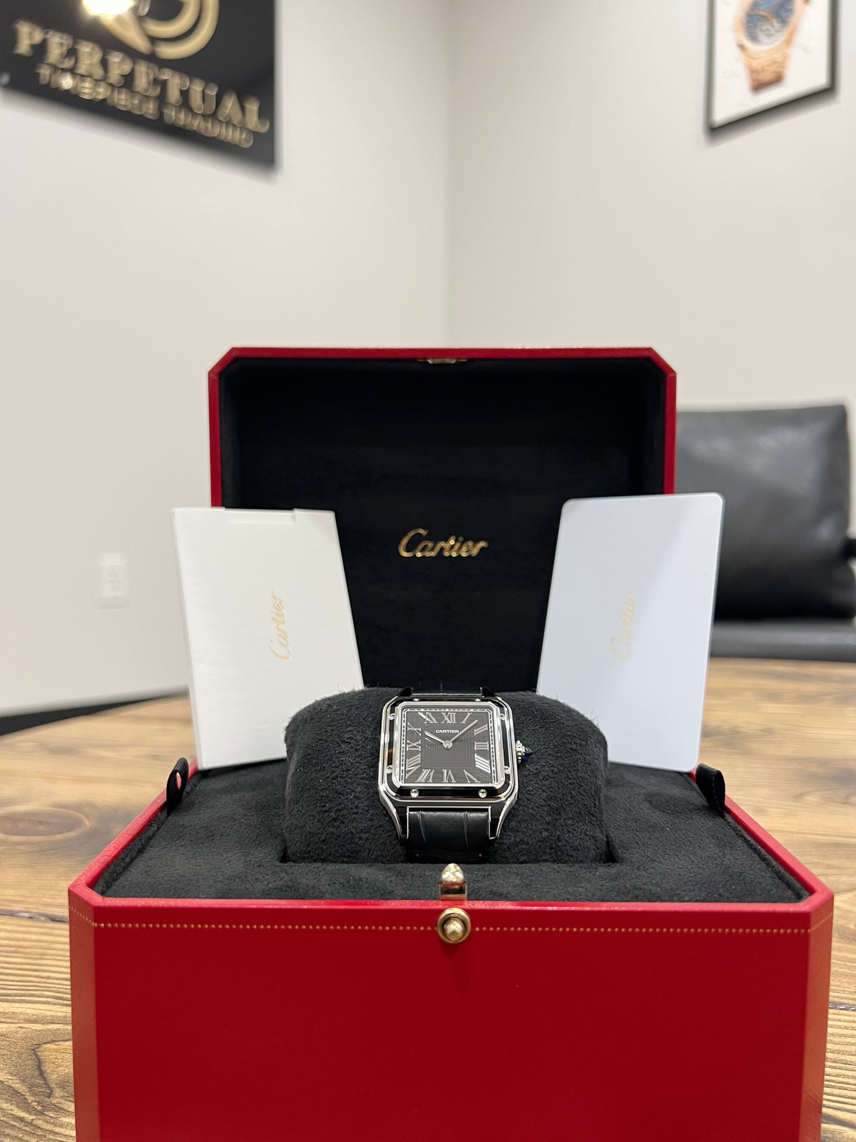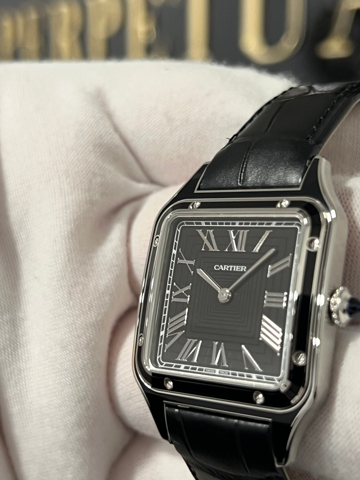 This is a beautiful and special timepiece. Featuring a steel case with black lacquer, steel beaded crown set with a blue synthetic spinel cabochon, black square decoration dial with translucent lacquer, Roman numerals, steel sword-shaped hands and a sapphire crystal. This is the dumont Large model. Call or text Chris at 631-560-2269 for more information on this amazing Santos Dumont Black WSSA0046