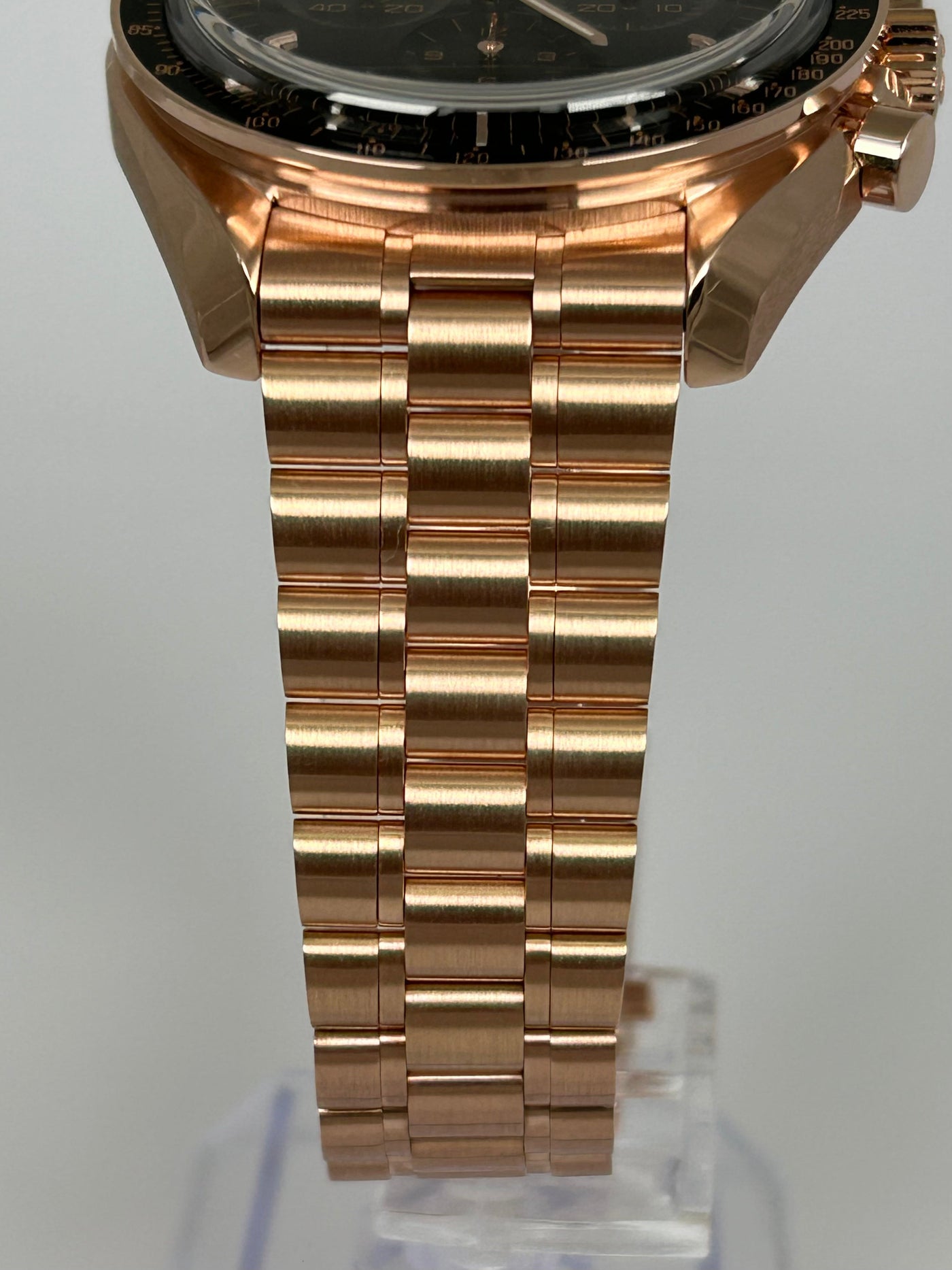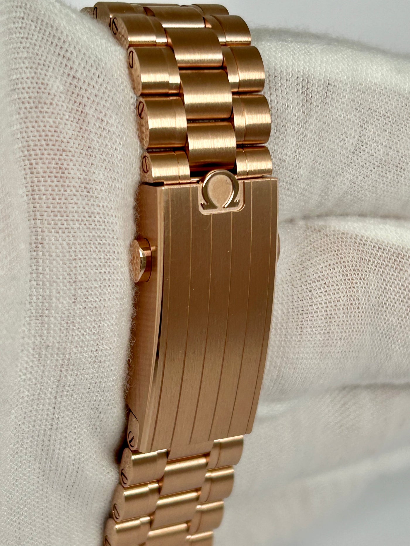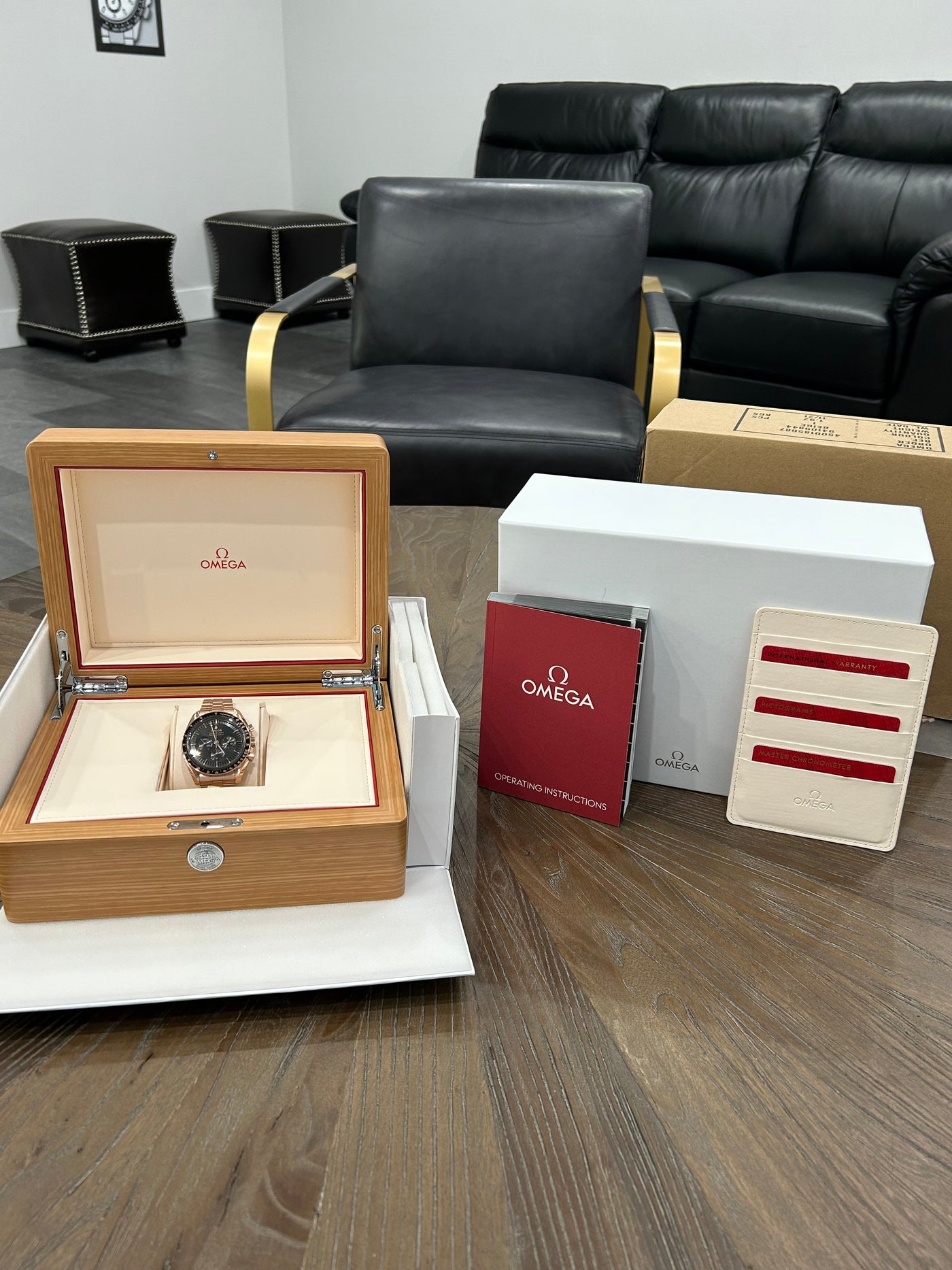 This beautiful Speedmaster is in unworn condition and features a rose gold case and bracelet. The Chronograph movement and black dial give it a rich and stunning look. Includes boxes, manual, and undated warranty card.