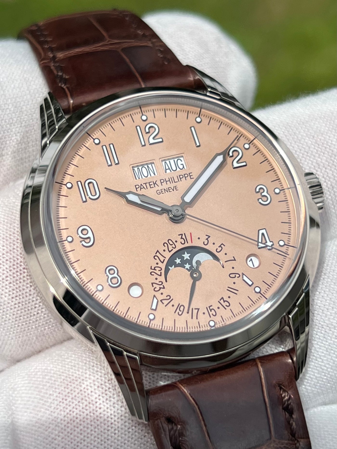 The Salmon grand complication perpetual calendar is a watch that needs no introduction. A product of one of the best watch manufacturers in the world, Patek Philippe. The white gold gives the watch an elegant and classy look while the salmon dial gives the presence you would want out of a watch of this caliber! Call or text Chris at 631-560-2269 to discuss more about this amazing Patek perpetual calendar salmon 5320g-011