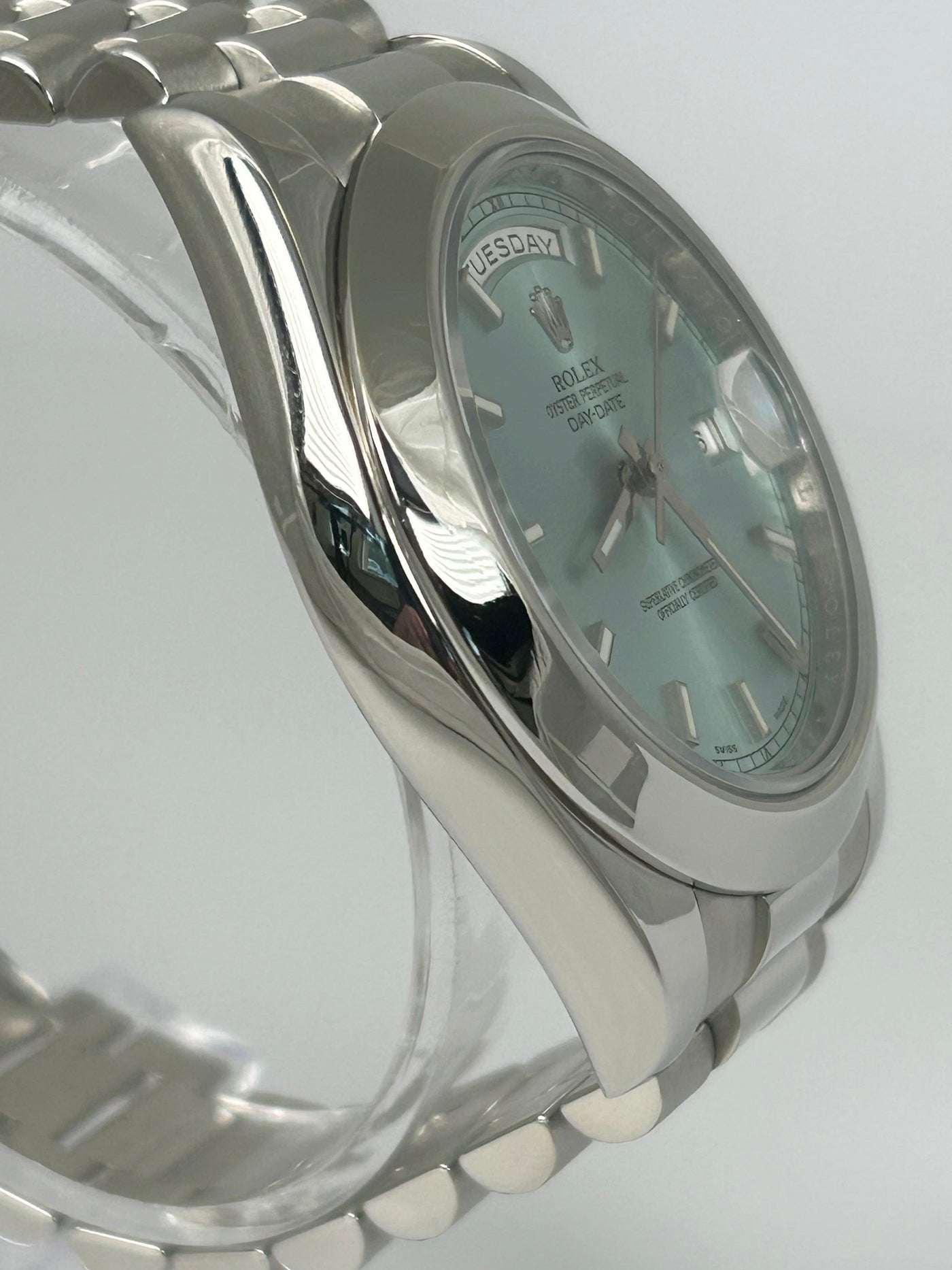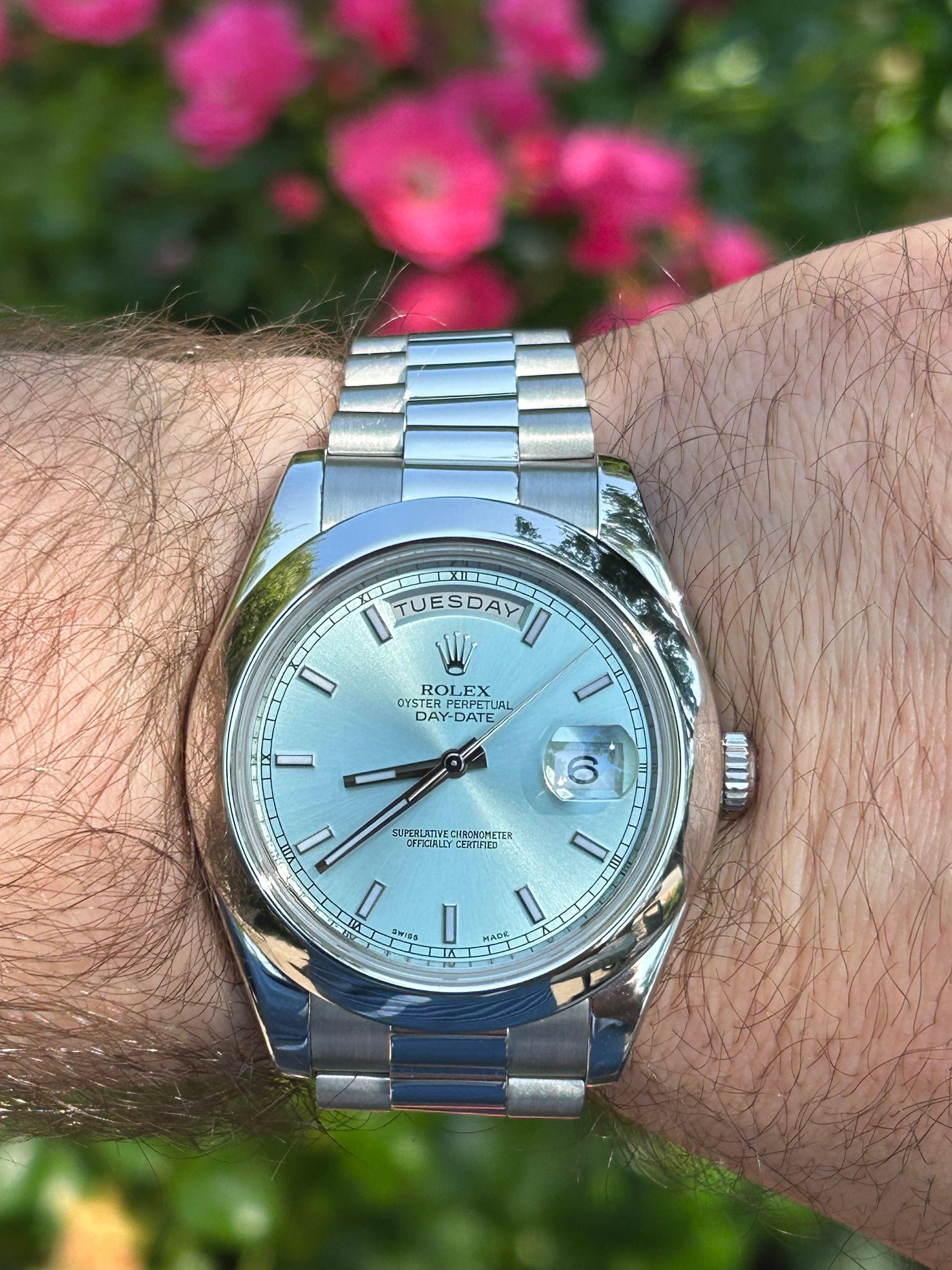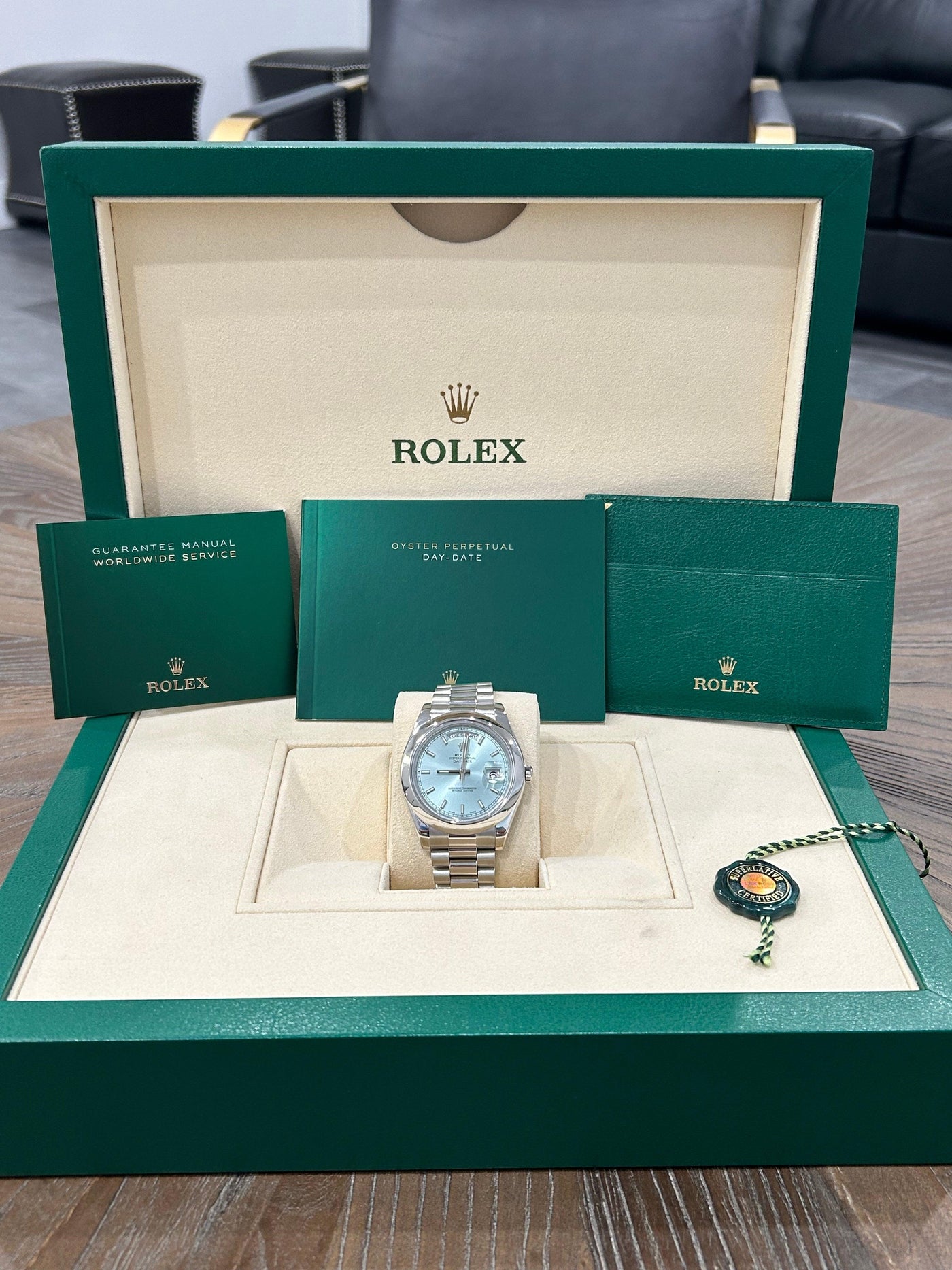 This rare and very special day date is in stock and ready to go! Mint condition. Get in touch today about this amazing rolex day-date 41 glacier blue platinum rare discontinued 218206.