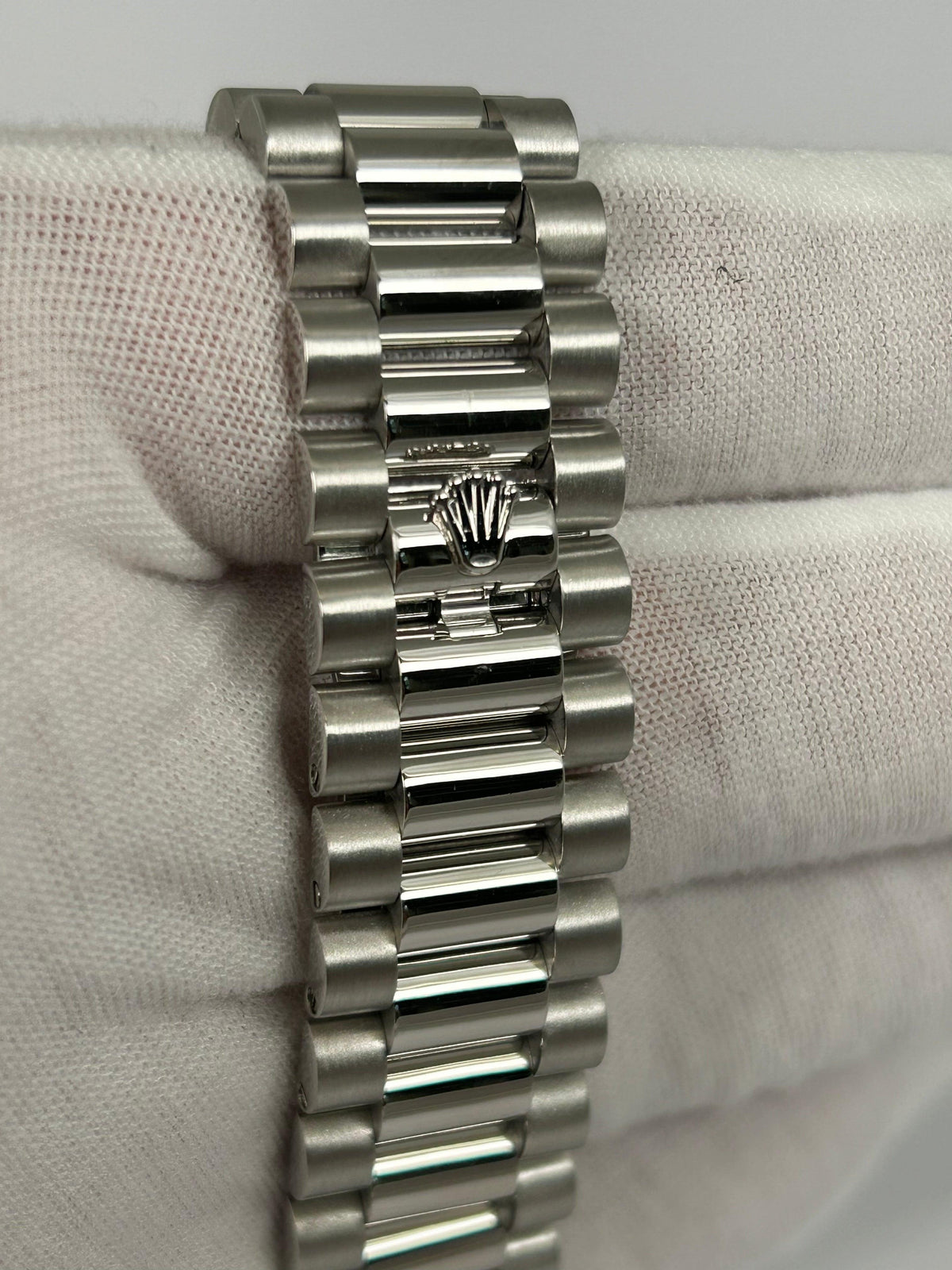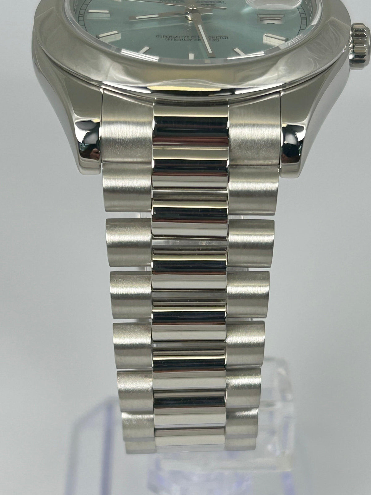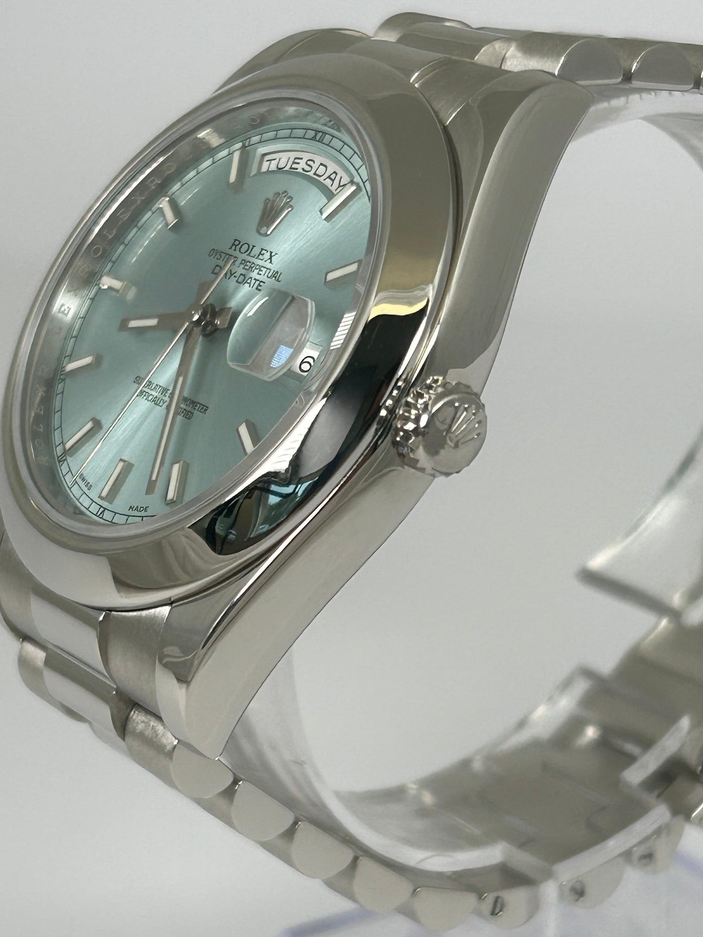 This rare and very special day date is in stock and ready to go! Mint condition. Get in touch today about this amazing rolex day-date 41 glacier blue platinum rare discontinued 218206.